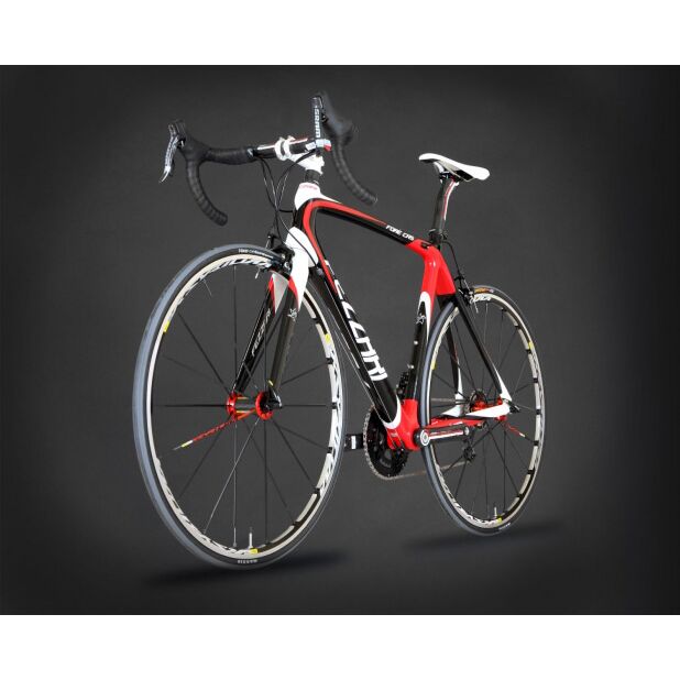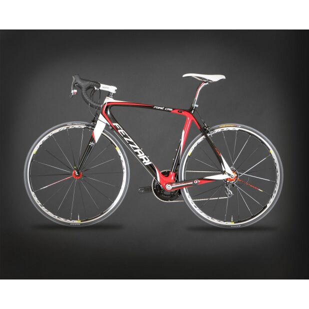 Take, for instance, the state of the art proprietary Fezzari Racing Design Xr7 3K monocoque carbon fiber frame. We used the highest grade of carbon fiber available on the market. We made it even stiffer laterally by enlarging the bottom bracket shell and adding the BB30 bottom bracket/crank design, strengthening the headtube and making it more laterally stiff by enlarging the diameter to a 1.5" tapered design. We've also enlarged the seatstays near the rear axle for more lateral rigidity. We made the Xr7 frame even more vertically compliant for those rides on the cobblestones. We've done this by using an oval design in our top tube and down tube.  The new Xr7 frame is even more aerodynamic than before with the new F4 ultralight bladed carbon fork and internal cable routing on the top tube.  The Xr7 frame was recently tested to be one of the most durable frames on the market, and it weighs a mere 900 grams. Strength, lightweight, rigidity where you need it most, and flexible enough to take the edge off of rough roads -- it's the perfect frame for anyone who wants to get the most out of their riding experience.